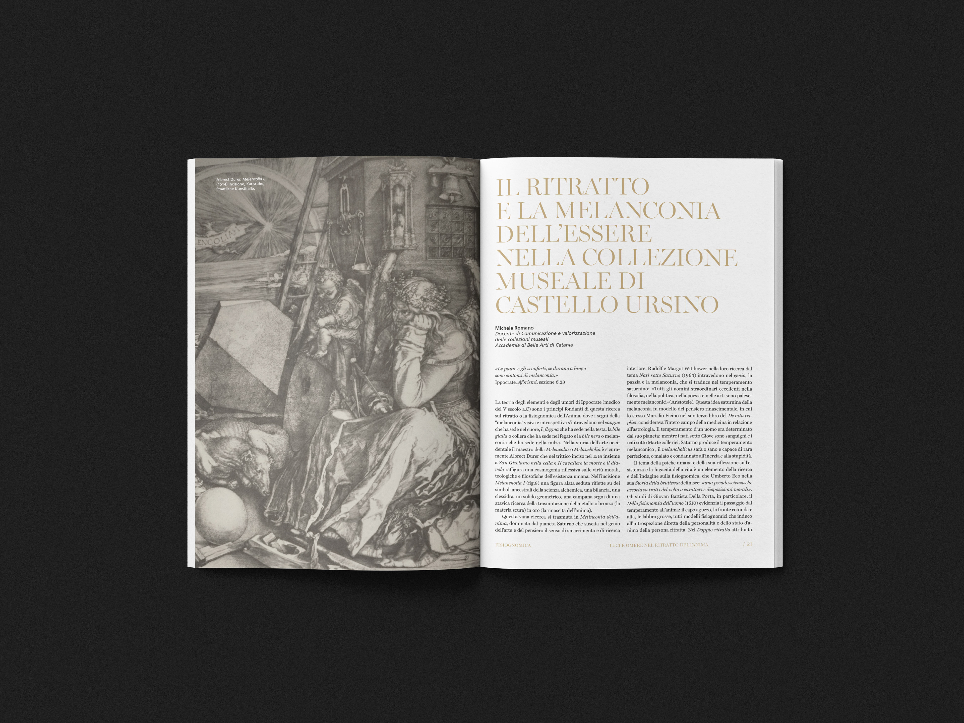 «[...] Nella Pinacoteca civica di Castello Ursino, frutto di una attenta e colta ricerca collezionistica, è ben presente una indagine visiva fisiognomica e melanconica, dove la cifra stilistica di un Pietro Novelli, Mattia Preti, Jusepe de Ribera, Mario Minniti e tanti altri invitano ad un dettagliato percorso dell’iconografia e iconologia dell’anima. [...]»